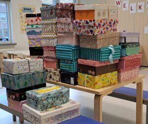 Als school wilden we onze dankbaarheid graag delen met anderen. Daarom hebben we samen met kinderen en ouders schoenendozen gevuld voor Stichting GAIN. Deze stichting zet zich in voor mensen in nood, in binnen- en buitenland. Ze zorgen ervoor dat de gevulde schoenendozen terechtkomen bij kinderen die het moeilijk hebben. Kinderen die soms geen speelgoed, schoolspullen of warme kleding hebben. We zijn dankbaar dat we samen maar liefst 36 dozen mochten inleveren! Wat bijzonder om te zien hoe iedereen zijn steentje heeft bijgedragen.